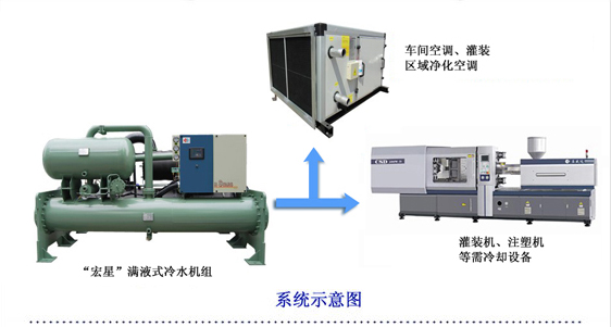 1、系统选用"宏星"满液式冷水机组,高效节能,COP达5.8;
